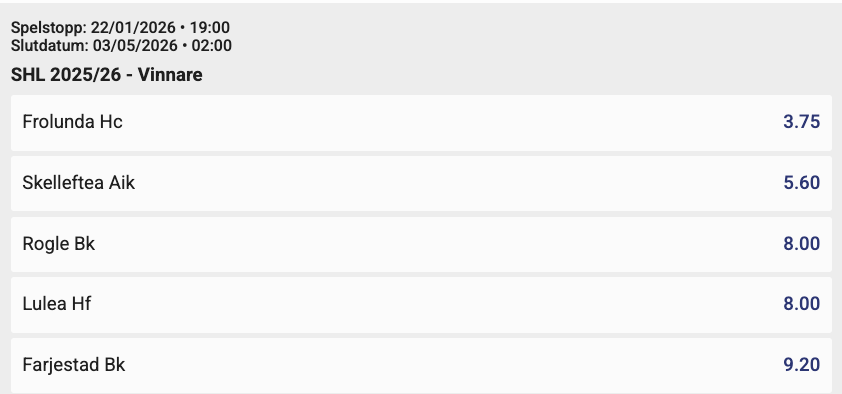 Hos DBET hittar du odds till alla matcher och även odds på vilket lag som vinner SHL. Just nu är Frölunda favoriter till 3,75 gånger pengarna. Här under kan du se hur oddsen ser ut just nu.